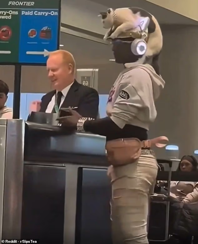 El protagonista ha sido identificado como Jeremy Smith, un hombre que sorprendió a quienes se encontraban en la terminal al pasearse con el animal sin ocultarlo de forma convencional. El felino, de pelaje blanco y negro, permanecía equilibrado sobre su cabeza mientras avanzaba por el aeropuerto.